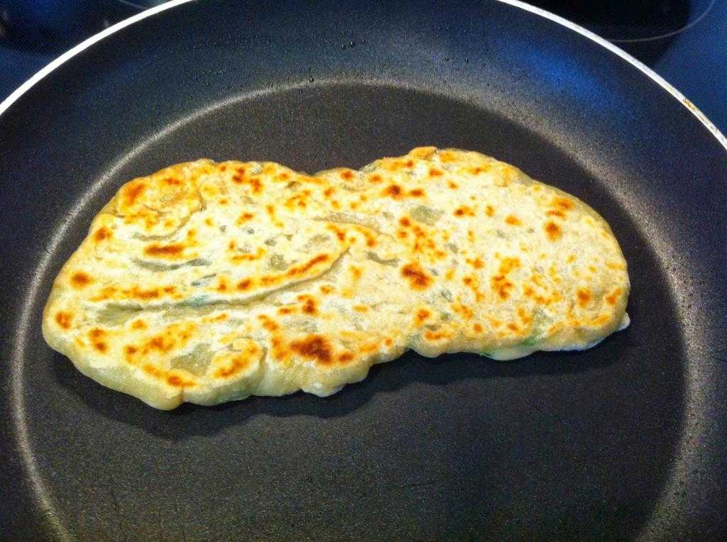 Смажьте большую антипригарную сковороду растительным маслом и нагрейте. Поместите по одной лепешки с зеленью в сковороду и жарьте до появления коричневых пятен на поверхности. Тщательно переверните и приготовьте так же на второй стороне. Подавайте целиком или разрезав на куски.