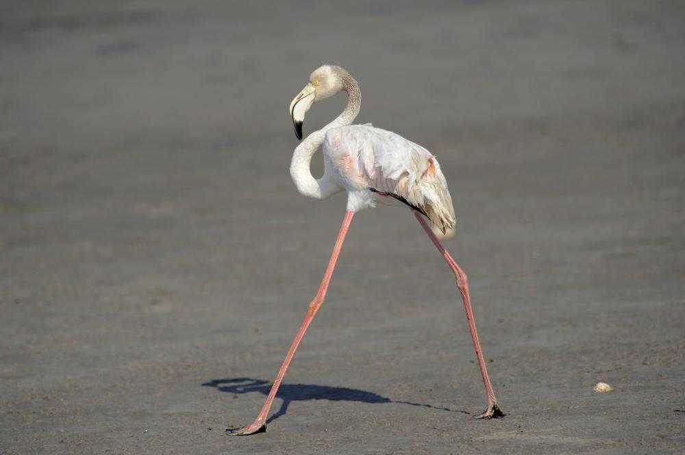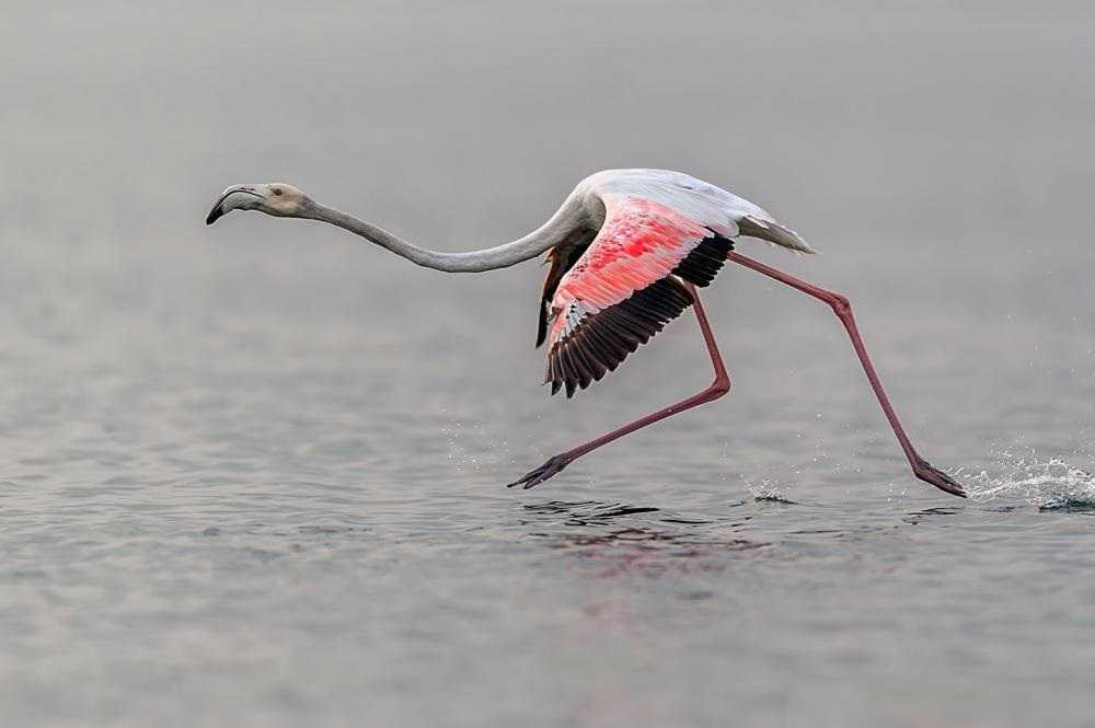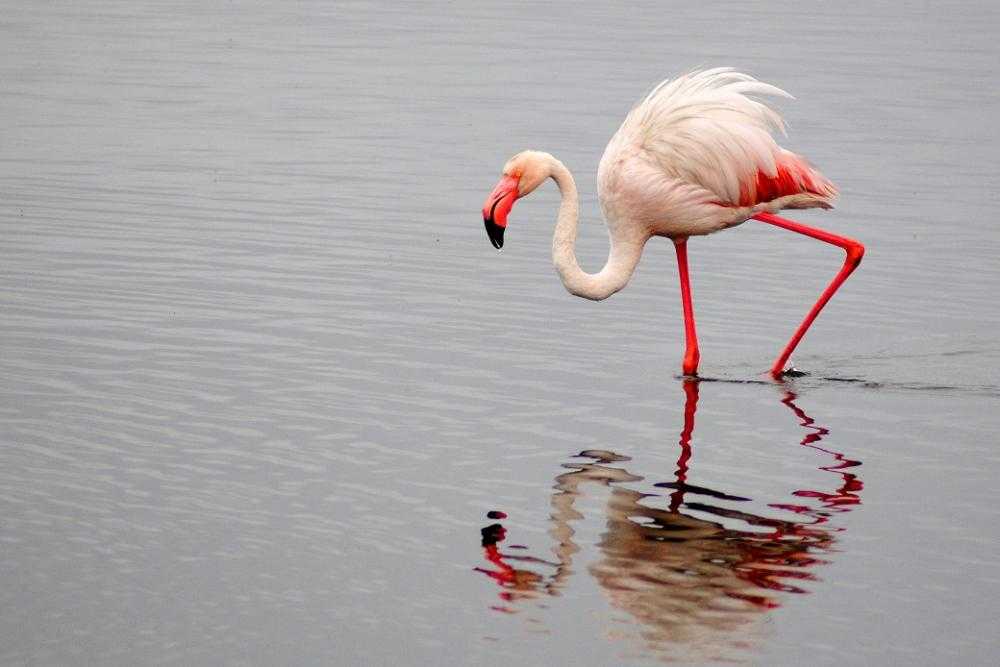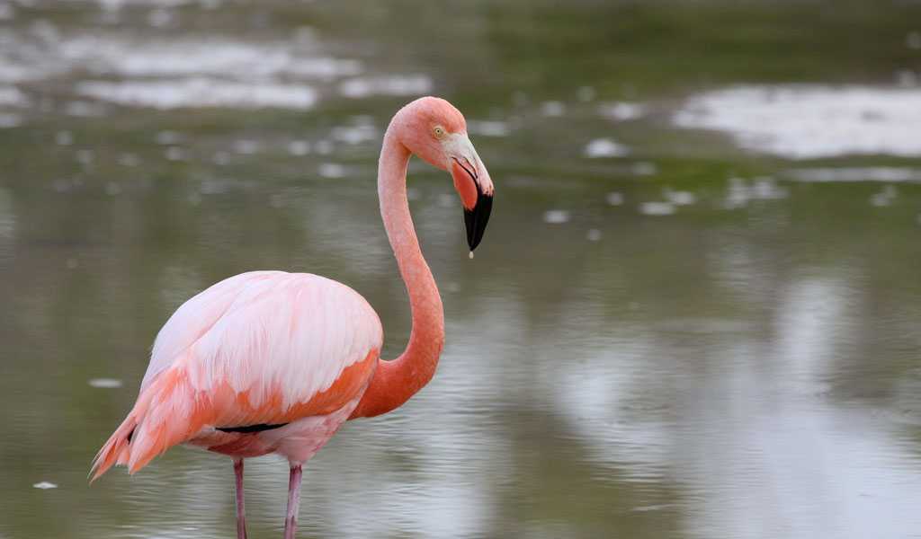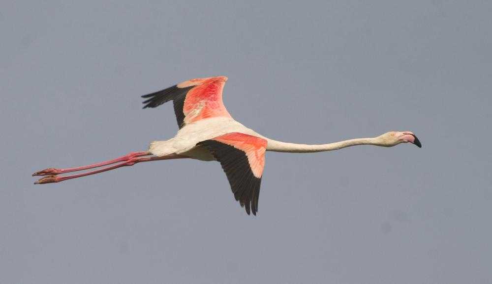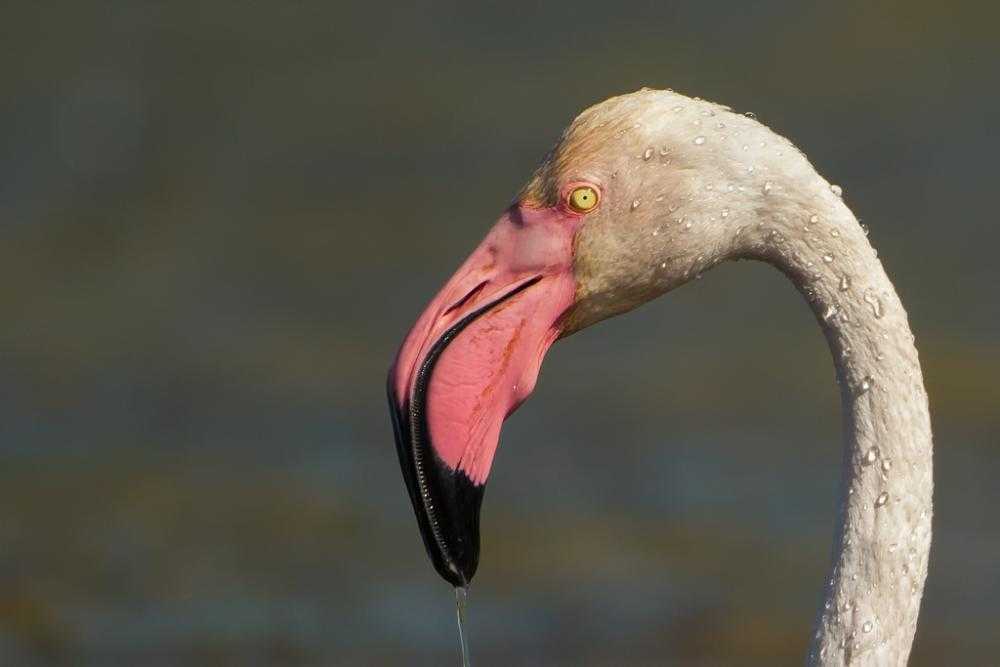 На фото видна еще одна отличительная черта розовых фламинго – небольшая голова с массивным клювом, круто изогнутым вниз. Такое строение клюва обусловлено питанием птицы – необходимостью процеживанием воды в поиске мелкого корма. Шея у птиц очень тонкая и выгнутая в форме буквы S.