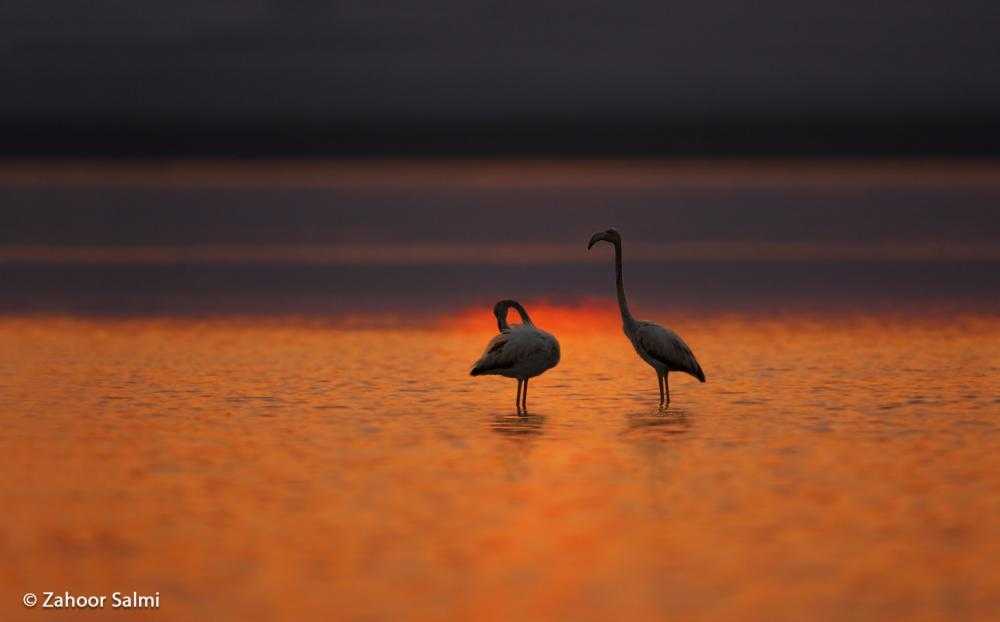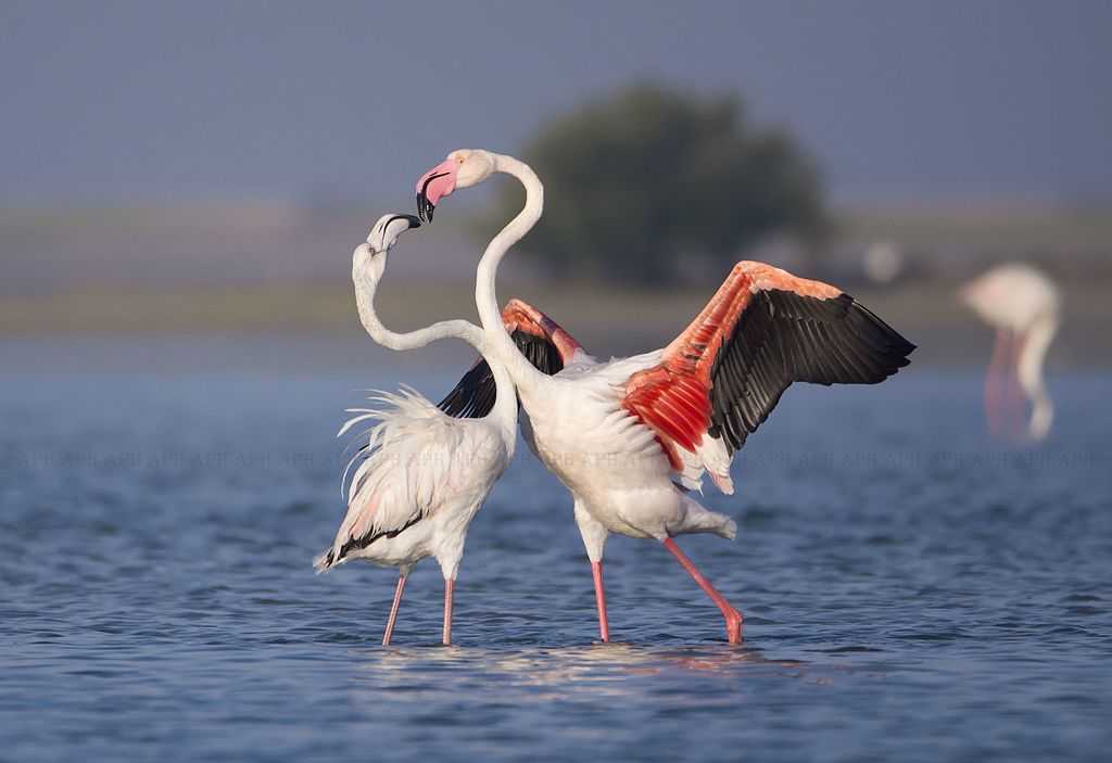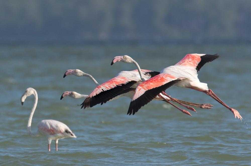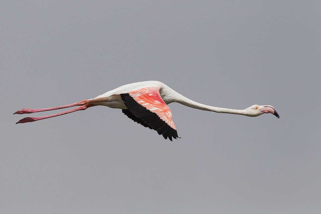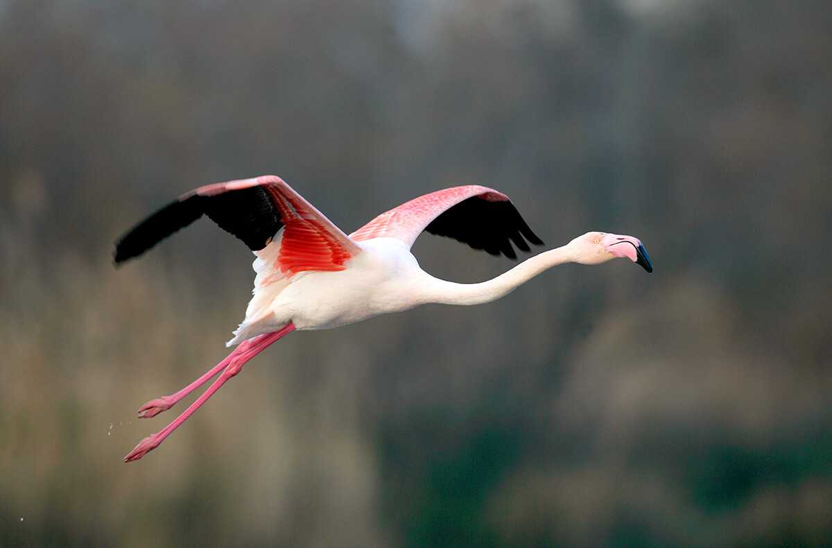 На фото видна еще одна отличительная черта розовых фламинго – небольшая голова с массивным клювом, круто изогнутым вниз. Такое строение клюва обусловлено питанием птицы – необходимостью процеживанием воды в поиске мелкого корма. Шея у птиц очень тонкая и выгнутая в форме буквы S.