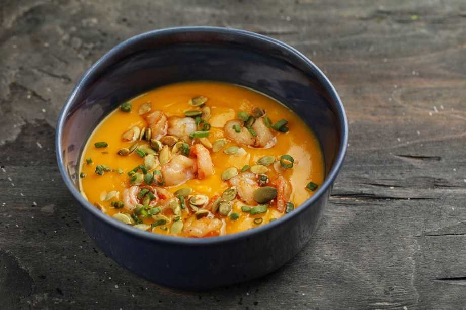 При подаче украшаем суп креветками (3-4 штуки на порцию), обжаренными тыквенными семечками, несколькими каплями тыквенного масла, луком сибулет.