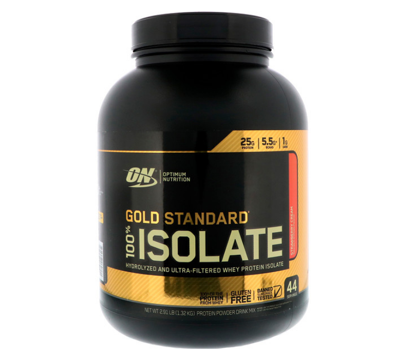 Обычно производители пишут на упаковке, сколько калорий содержится в каждой порции протеинового коктейля. Лучшим для похудения считается изолят протеина. Например, отлично справляется со своими задачами Optimum Nutrition, Gold Standard, 100% изолят протеина, клубничный крем, (1,32 кг). В банке 29 порций. В каждой порции по 24 г белка, 1 грамм сахара. Калорийность порции составляет всего 100ккал. Можно с успехом заменять таким коктейлем 1 или даже 2 приема пищи. Особенно в период, когда вы стремитесь похудеть и заменить жировую ткань мышечной. Можно выбрать любые вкусы, а их здесь множество. Банановый, ванильный, шоколадный, клубничный — выбирайте любой!