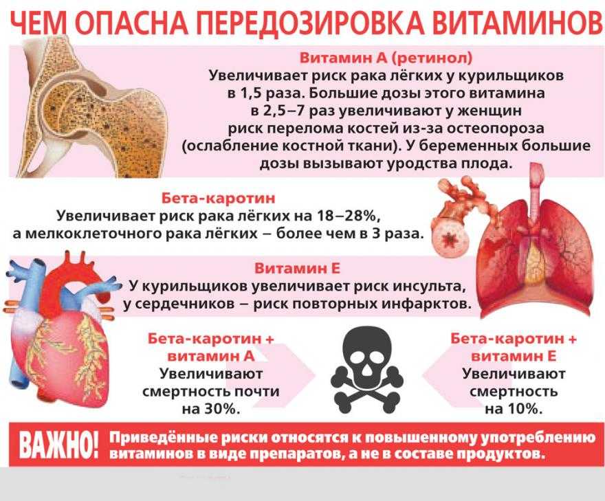 Организм — не кладовка, в нёго впрок ничего отложить нельзя. Всё, что не усваивается, — выводится печенью и почками. Если витаминов недостаточно — это плохо. Но переизбыток приводит к отравлению организма, может вызвать аллергическую реакцию, стать причиной проблем с почками, печенью, негативно повлиять на работу других внутренних органов.