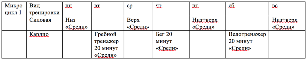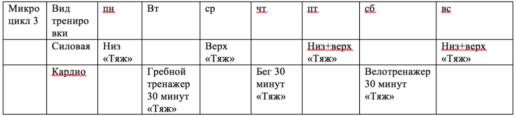 Пример тренировочной недели 3 (тяжелая нагрузка) кардио+силовые: