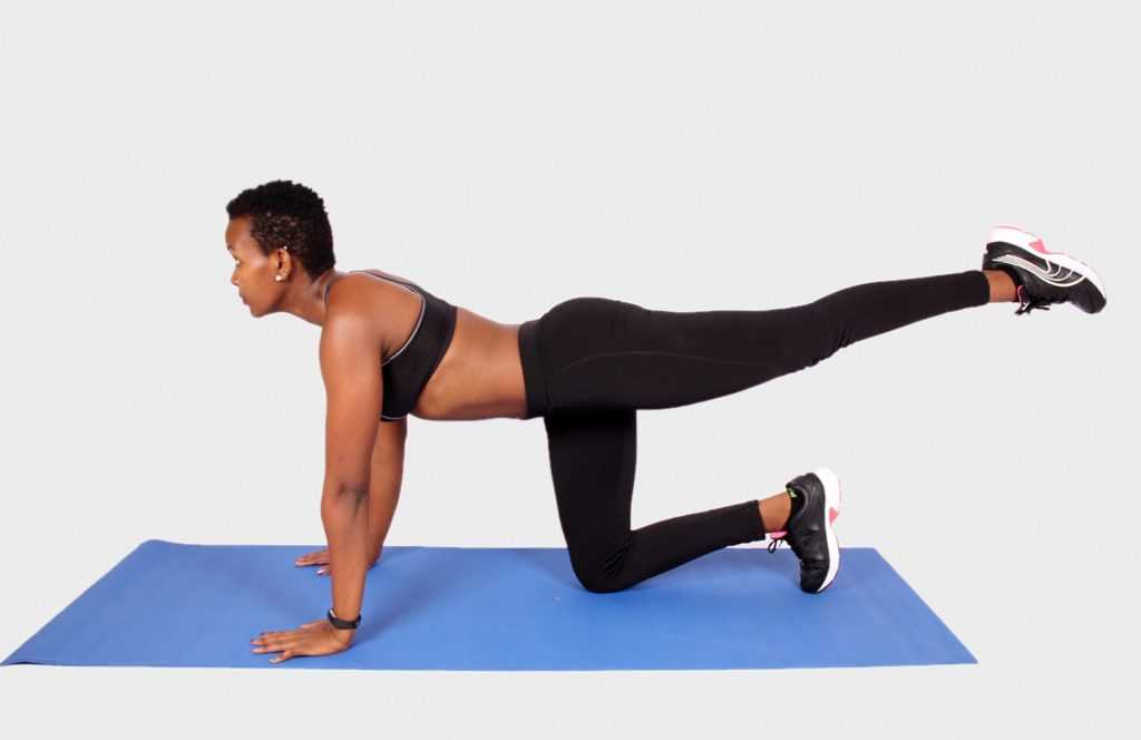- Примите упор на локтях и коленях. Одна из рук упирается в поверхность ладонью, ногой с этой же стороны делается подъем. Выпрямляйте рабочую ногу и отводите ее в сторону.