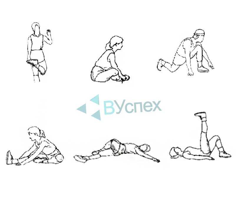- Правую ногу заводим за спину, берем ее левой рукой и тянем вверх 3 с. по 10 раз на каждую ногу.