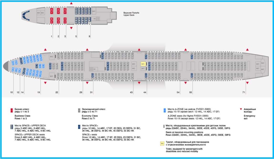 Один находится в конце самолета, другой – между 20 и 22, что свидетельствует о неприятных запахах на этих местах, третий – около 43 и 44, на которые билеты раскупают в последнюю очередь. В наличии гардеробная, располагающаяся возле 54 и 59, и кухня около 31 и 34. Тут же, рядом с 31, находится спуск со второго этажа.