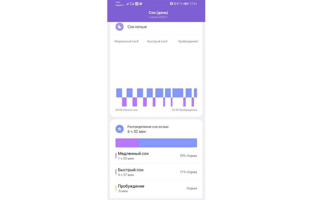 К точности работы никаких претензий нет, браслет правильно посчитал как время отхода ко сну, так и время пробуждения. Ниже вы можете ознакомиться со статистикой в приложении. Это все данные, которые предоставляет Remi Band. Никаких оценок сна, выявления распространенных проблем и рекомендаций в приложении нет, поэтому в этом плане устройство сильно уступает «топовым» моделям рынка.