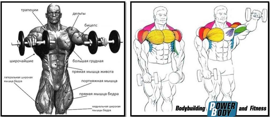 Кроме этого, передняя часть дельт задействована в тренировках мышц груди (жим штанги лежа), средняя — при отведении руки в сторону и одновременно вверх (подъем гантелей в стороны), задняя часть — при тренировках спины (тяга штанги к поясу).