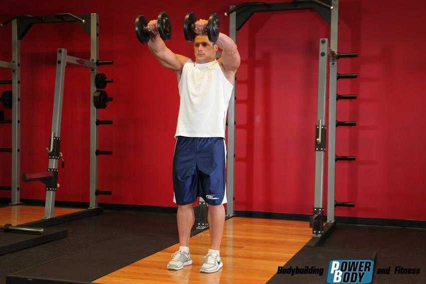 Сядьте на скамью. Гантели держите на высоте плеч прямым хватом. Поднимите гантели вверх до полного вытяжения рук. Медленно опустите до исходного положения.