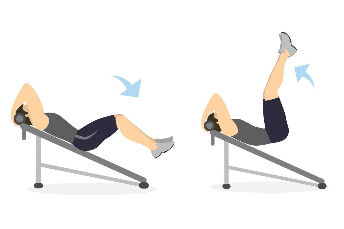 Усложненная вариация обратных скручиваний. За счет мышц пресса необходимо поднять ноги вверх, слегка оторвав поясницу от скамьи. |