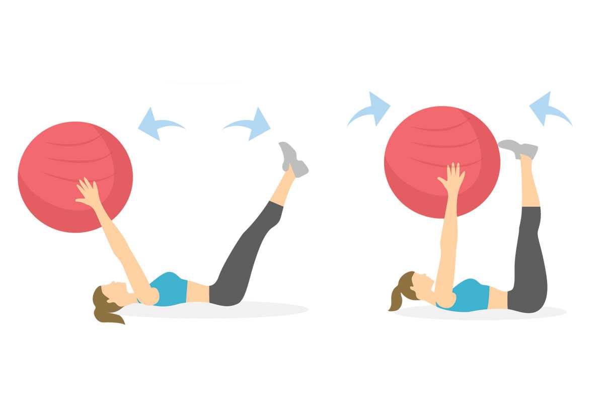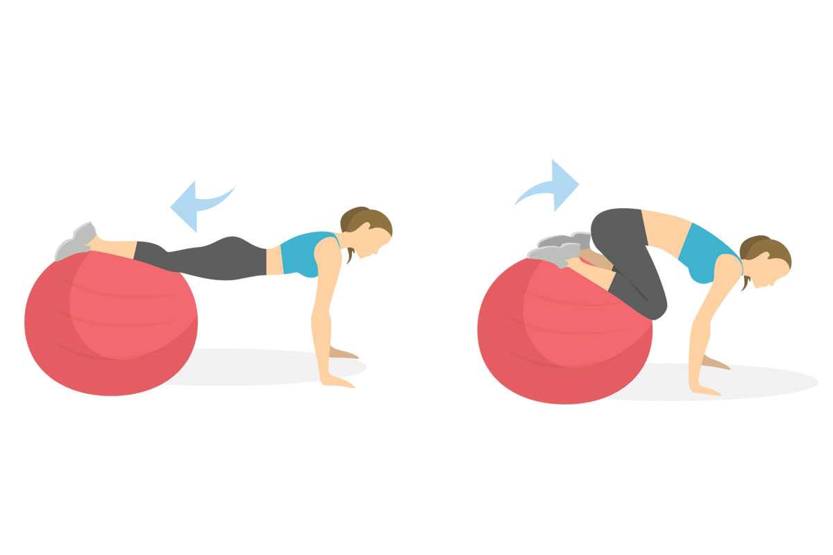 Теперь попробуем изменить положение плечевого пояса и стоп. В исходной позиции плечи прижаты к полу, а стопы располагаются на мяче.
