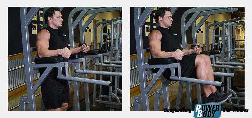 На брусьях упражнение выполняется аналогичным образом, с отличием в том, что упор принимается на брусьях на вытянутых прямых руках. Как и в первом варианте, верх корпуса жестко зафиксирован, спину держится прямо, при подъемах в таз немного подворачивается вперед. Ваши руки должны быть хорошо развиты, так как на брусьях мышцы рук выполняют функции упора и поддерживания туловища, а также стабилизации положение во время подъемов ног.