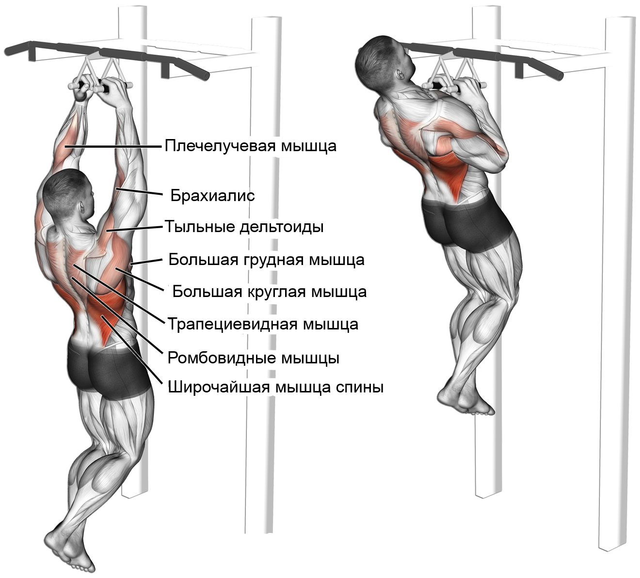 Обратный хват, то есть тот, при котором ладони смотрят на ваш корпус, наиболее популярен при подтягиваниях с узкой расстановкой рук. Благодаря такому расположению ладоней, а вместе с ними и рук, это упражнение является базовым для развития бицепса. Какие мышцы качает подтягивание обратным хватом, хорошо видно на картинке ниже.