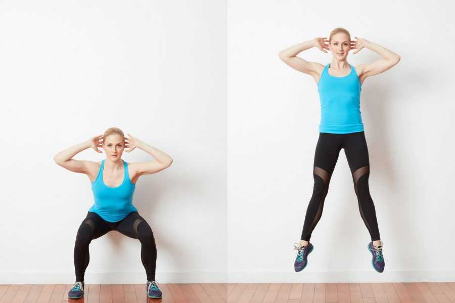 - Выпрыгивания вверх из низкого приседа 4 подхода по 20 раз