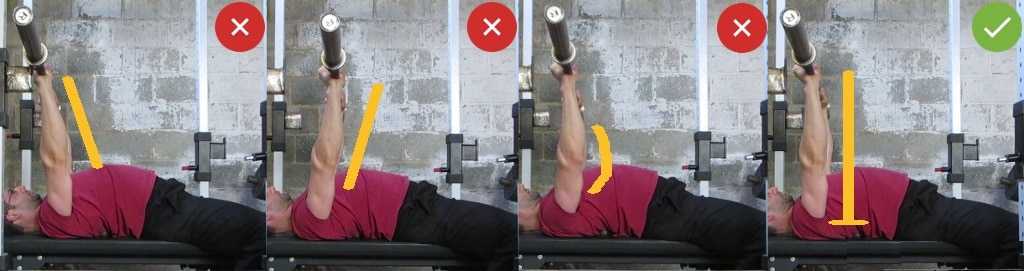 Фиксируйте положение локтей. Завершайте каждое повторение фиксацией локтей. Не оставляйте их в согнутом положении чтобы дополнительно нагрузить мышцы. Вы можете не справиться и уронить штангу себе на лицо и умереть. Фиксируйте локти в выпрямленном положении, чтобы ваш скелет, а не мышцы удерживали вес. Заботьтесь о ваших локтях – не перезагружайте их.