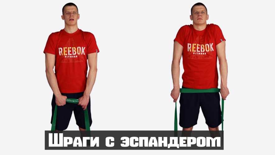 Если мы хотим иметь большую и развитую трапецию, то без ШРАГОВ нам не обойтись. Это отличное базовое упражнение. И к счастью для нас, его можно выполнять с эспандером. При этом, снизится нагрузка на позвоночник. Что очень хорошо для людей, у которых имеются травмы данной области.