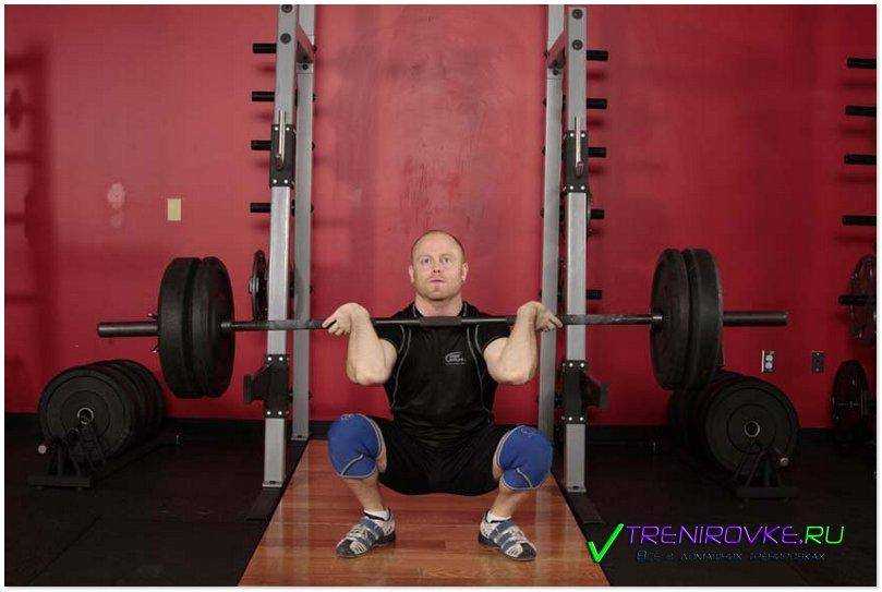 Встаньте под гриф, слегка присядьте, прогнувшись в пояснице (не округляя спину), расположите штангу на трапециях, и снимите ее со стоек. Сделайте пару шагов назад, чтобы не задевать в процессе приседаний раму;