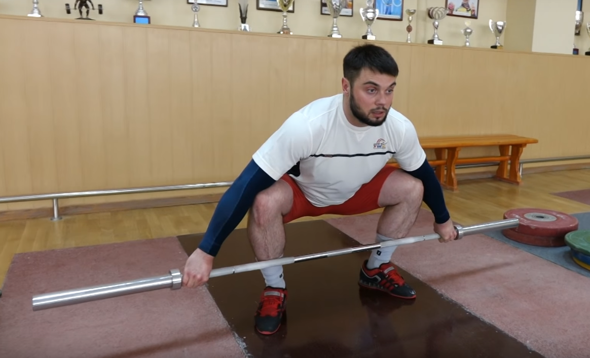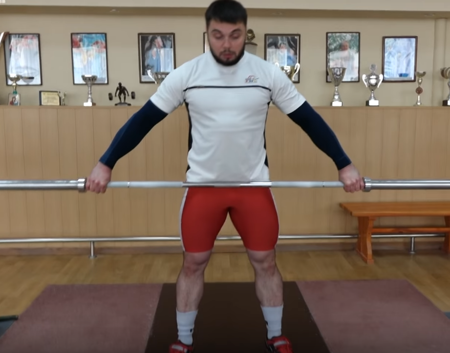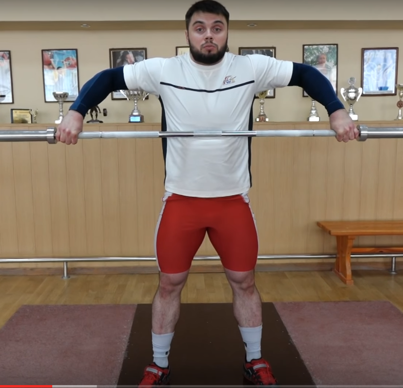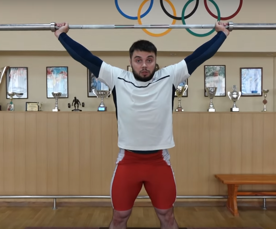 положении остается буквально пара сантиметров. Берет штангу толчковым хватом,