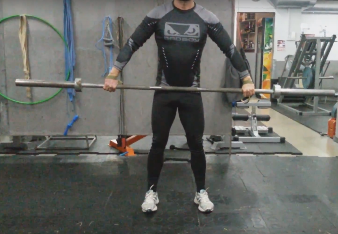 на грифе на расстоянии чуть шире плеч. Слишком узкая постановка рук приведет к тому, что кисти будут ложиться на