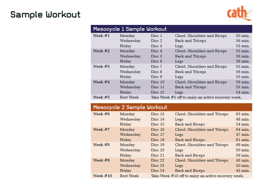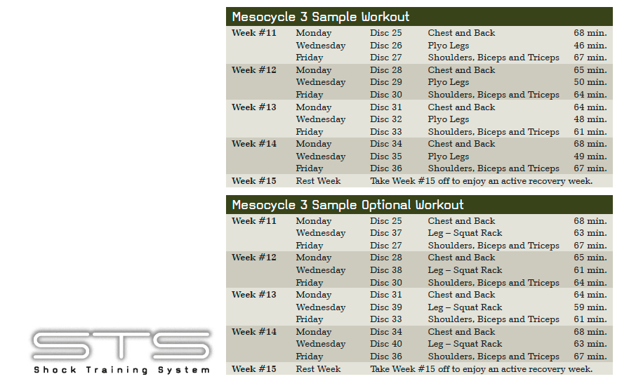 STS – это силовой тренинг, которым необходимо заниматься три раза в неделю. Каждая неделя мезоцикла состоит из двух тренировок на верхнюю часть тела и одно на нижнюю.