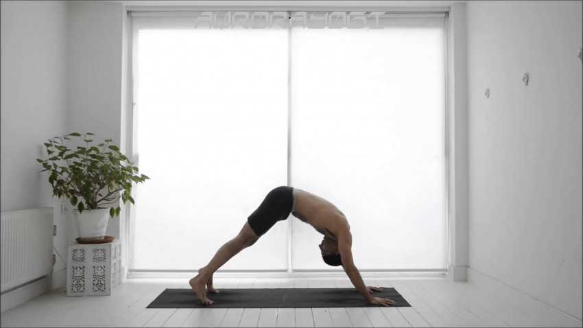 Расставьте руки на ширину плеч и широко разведите пальцы. Укрепитесь на обеих руках, особенно надавливая большим и указательным пальцами, затем начните поднимать бедра вверх. Это будет похоже на промежуточный переход в Собаку Мордой вниз.