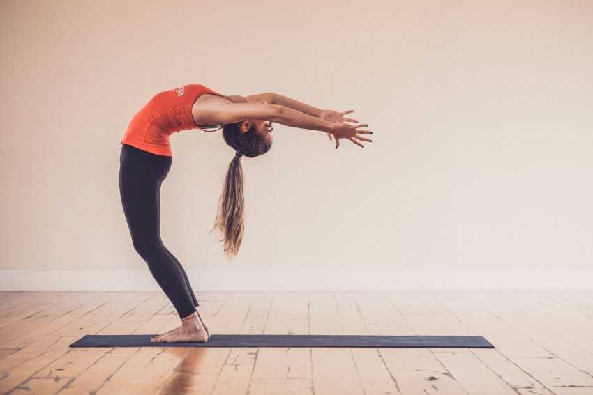 Шея, спина и ноги должны быть прямыми. Удерживая равновесие, медленно прогибайте все тело назад, для равновесия слегка выдвинув бедра вперед, вес тела — на локтях, предплечьях. Сохраняйте баланс, руки — с двух сторон от головы ладонями вниз. Сделайте паузу, сделайте несколько глубоких вдохов. Медленно поднимите голову, спина выгнута, плечи — точно над локтями. Прогибайтесь как можно сильнее, сохраняя при этом равновесие. Голову поднимите максимально высоко. Дышите через нос. Продолжайте выгибать спину, опуская стопы как можно ближе к голове.