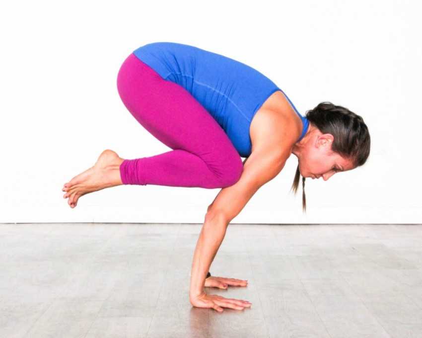 Медленно согните колени и перейдите в бакасану — позу ворона. Поставьте колени на руки чуть выше локтей, как будто пытаетесь охватить ими руки. Плотно сцепите руки с ногами. Не скругляйте спину, вытягивайте позвоночник, тяните плечи и лопатки назад, проворачивайте таз назад. Слегка подтяните промежность и подтяните пупок к позвоночнику.