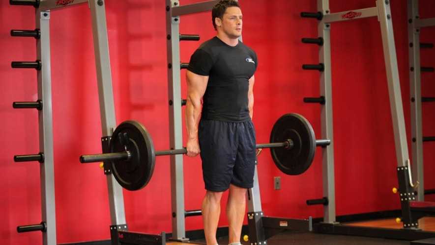 - Подходим к грифу и становимся к нему спиной. Беремся за него прямым хватом (ладони смотрят назад) на ширине плеч.