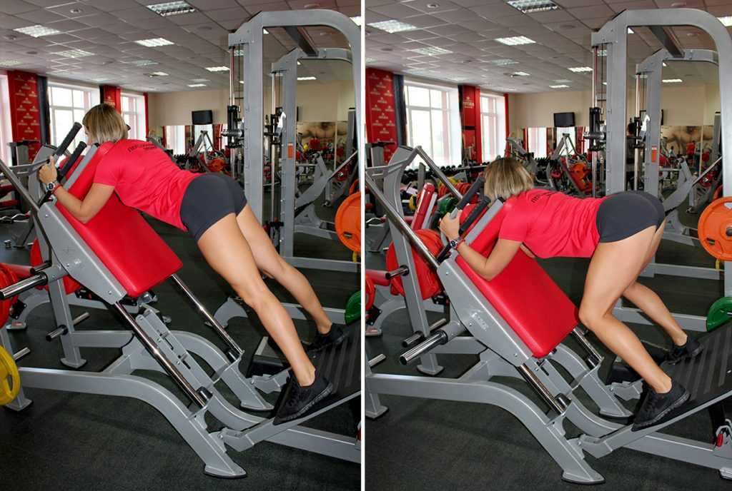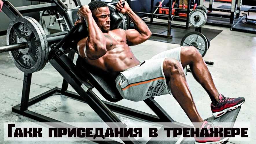 Сядьте в гакк. Движения на тренажере имитируют приседания с грузом, в то время как спина зафиксирована (прижата к платформе).