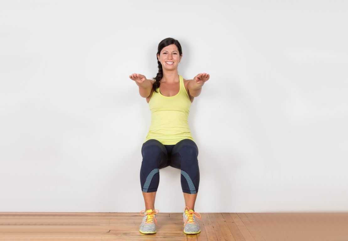- Опускайте, пока не сядете в стул (воображаемый). Бедра должны оказаться параллельны полу.