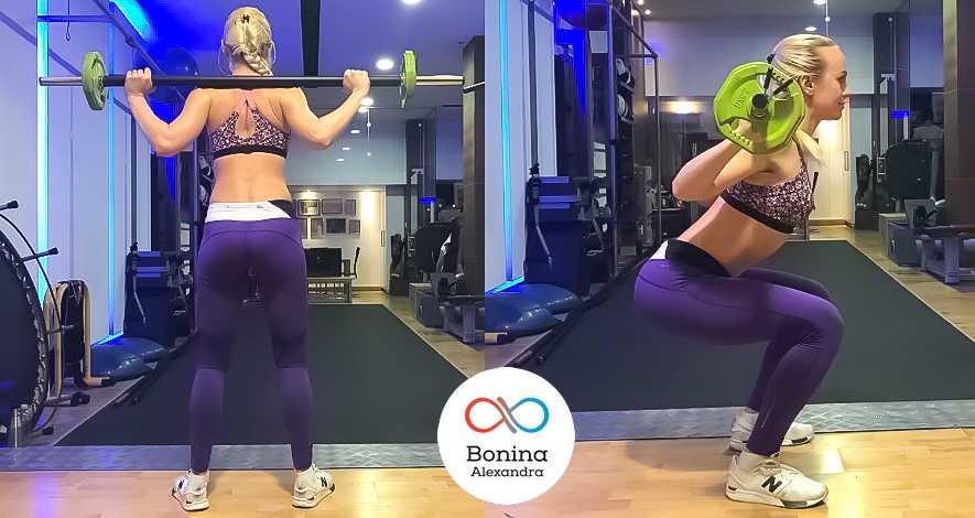 Штанга берется со стоек, расположенных на уровне ключиц атлетки. Гриф лежит чуть ниже верхних пучков трапециевидных мышц так, чтобы спина могла оставаться напряженной. Хват на грифе – жесткий, запястья изгибать назад не нужно. На выдохе штанга снимается со стоек при помощи разгибания в коленных суставах, выполняется шаг назад и расстановка ног в стороны. Далее таз опускается вниз с выдохом, а колени – отводятся в стороны и сгибаются. Оптимальная глубина опускания таза – та, при которой сохраняется прямой спина, и отсутствует скругление в поясничном отделе. Вставать надо с выдохом, упираясь в пол всей стопой.