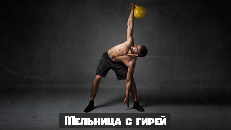 Данный вариант выполнения относится к силовым. Его используют в тяжелой атлетике. Работа с гирей позволяет не только укрепить пресс, но и активно задействует при подъеме ягодицы и мышцы задней части бедра. Так же при выполнении растягиваются мышцы нижней части туловища. Техника мельницы с гирей кардинально отличается от классической версии. Наклоны делаются в сторону, без вращательных движений. Вес гири подбирается согласно физической подготовки атлета.