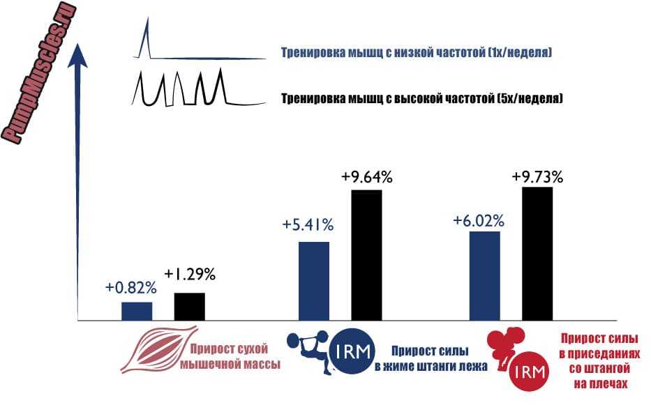 Исследование длилось 8 недель, по результатам которого ученные дали заключительную оценку, что обе группы прибавили как в силе, так и в гипертрофии мышц (смотрите график), но той группе, которая часто тренировалась, удалось немного больше превысить все показатели, причем в долгосрочной перспективе этот отрыв бы только увеличивался.