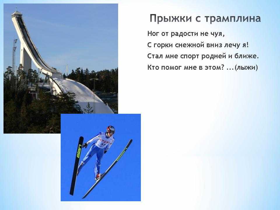 Прыжки с трамплина— вид спорта, включающий прыжки на лыжах со специально оборудованных трамплинов. Сноубординг- вид спорта, включающий в себя скоростной спуск с горного склона, выполнение акробатических элементов на специальной трассе и пр.