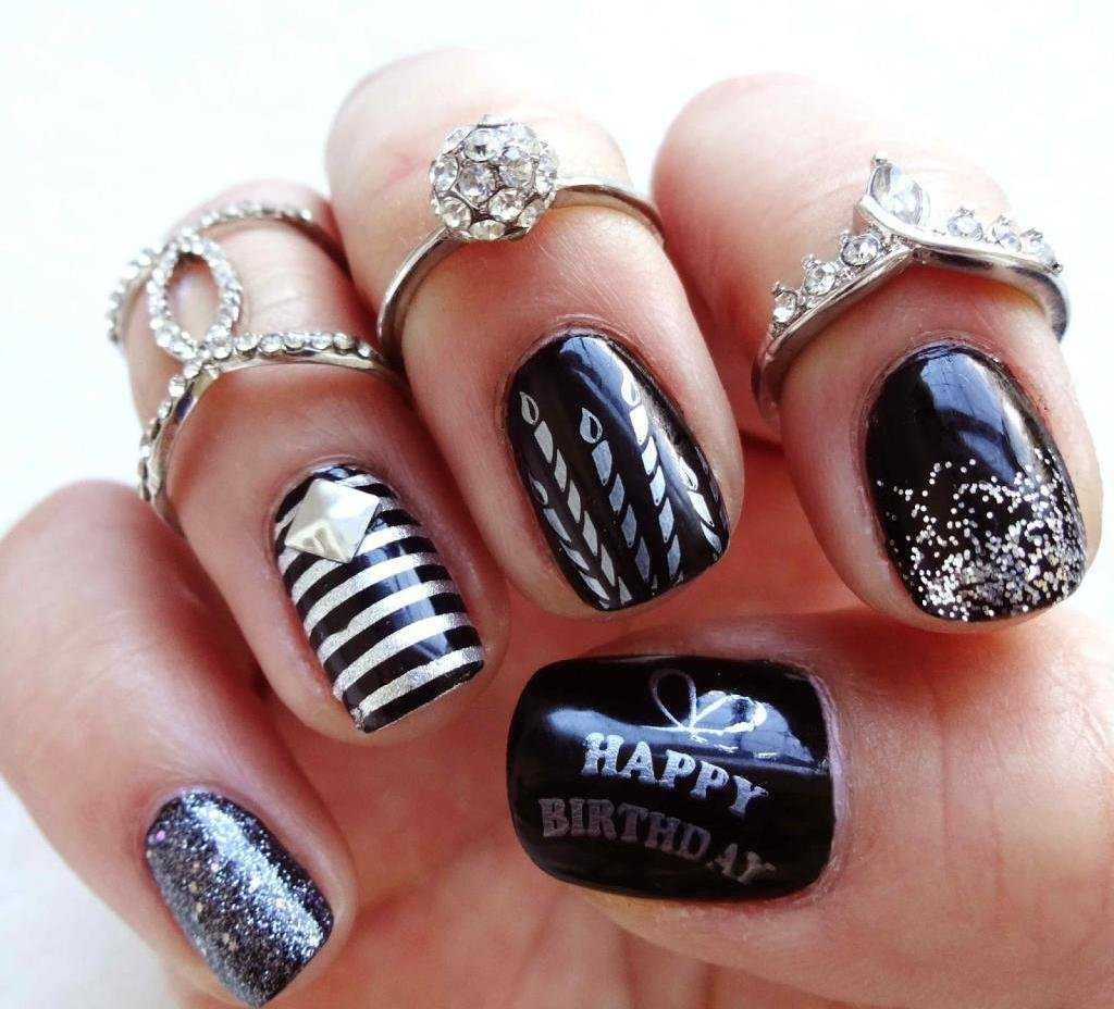 Разумеется, не каждая дама в возрасте готова изобразить на своих ногтях нечто напоминающее взрыв хлопушки, поэтому для них существует масса вариантов более спокойного праздничного маникюра. Например, черный маникюр с добавлением серебряного цвета. Кстати, сделать этот маникюр вы сможете и самостоятельно.