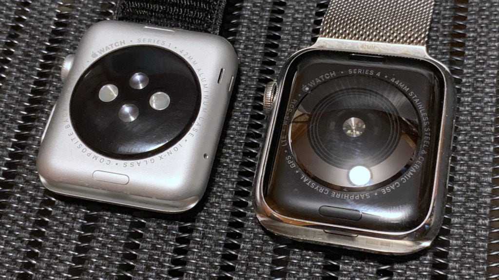 Вот, например, так выглядят датчики встроенных пульсометров в Apple Watch 3 и Apple Watch 4 (напомню о том, что Apple Watch 3 были самыми точными в исследовании, о котором я писал выше):