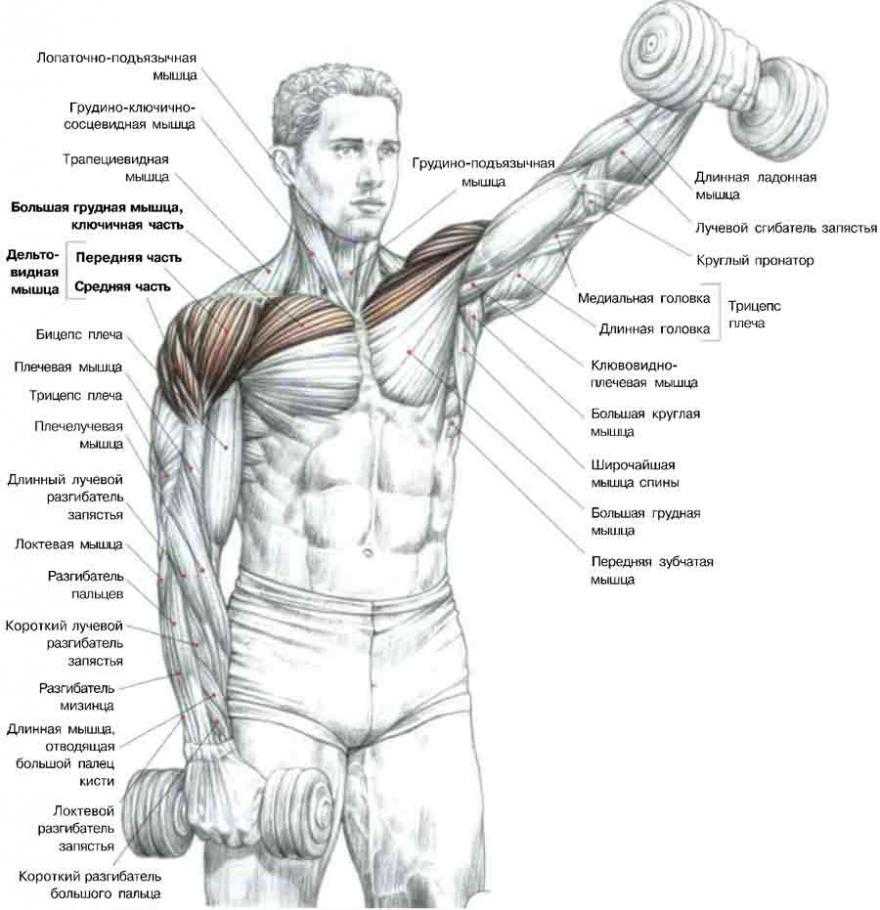 - суббота – плечи и спина (разведение рук со снарядом стоя, шраги, тяга гантели с упором на скамью другой рукой).