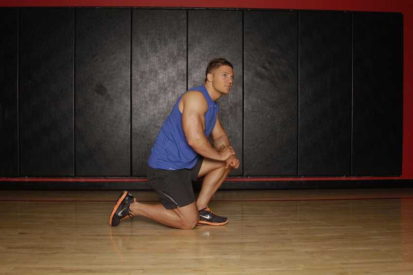- Одновременно сгибайте оба колена до тех пор, пока колено задней ноги не будет касаться пола, а передняя нога должна быть согнута под углом 90 градусов;
