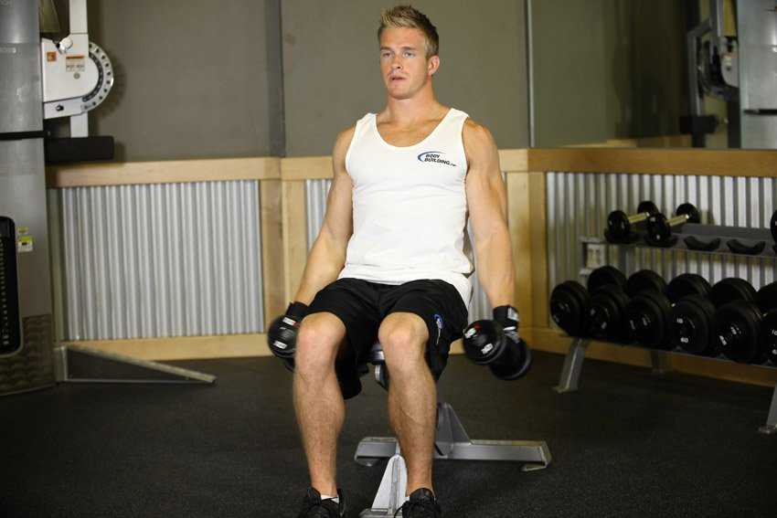- Сгибание рук с гантелями на наклонной скамье: 3-4 подхода из 8-12 повторений