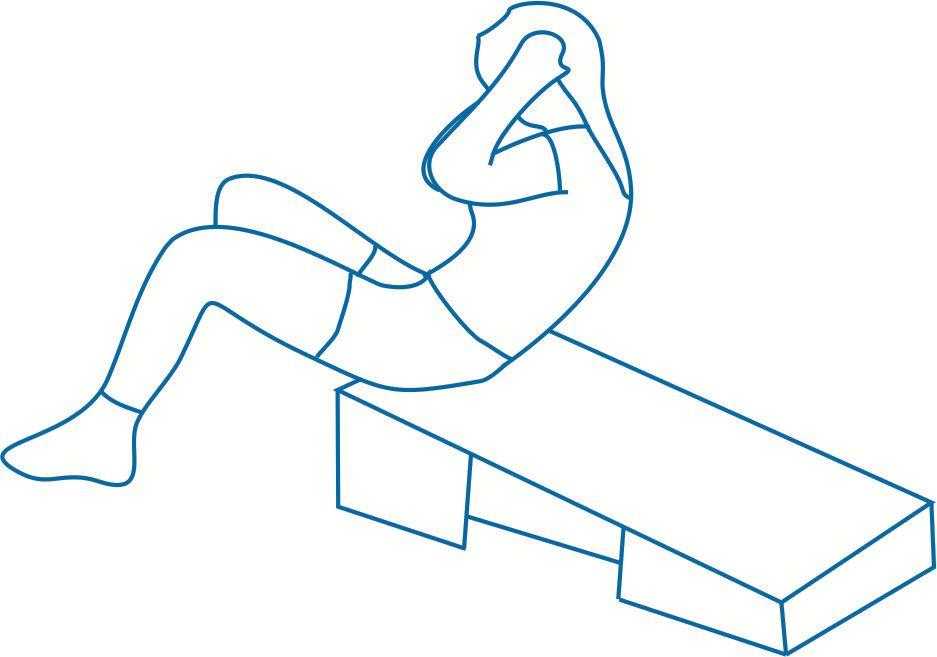 - Поставьте обе ноги на платформу, руки скрестите у груди и делайте подъемы туловища 20 раз медленно и 10 быстро. Если выполнять такое упражнение сложно, то уменьшите количество раз до 10.