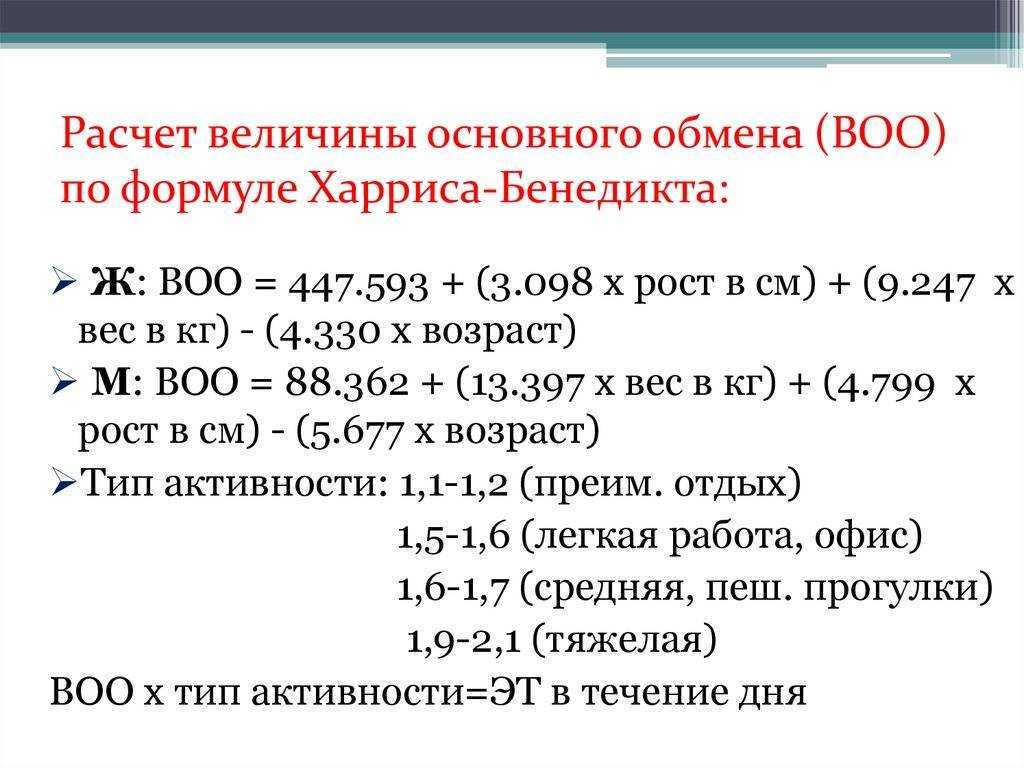Есть множество формул для подсчета необходимых калорий за сутки, но самой популярной является формула Харриса-Бенедикта. С годами она немного редактируется, усовершенствывается, так как условия жизни меняются и энергозатраты вместе с ними также.