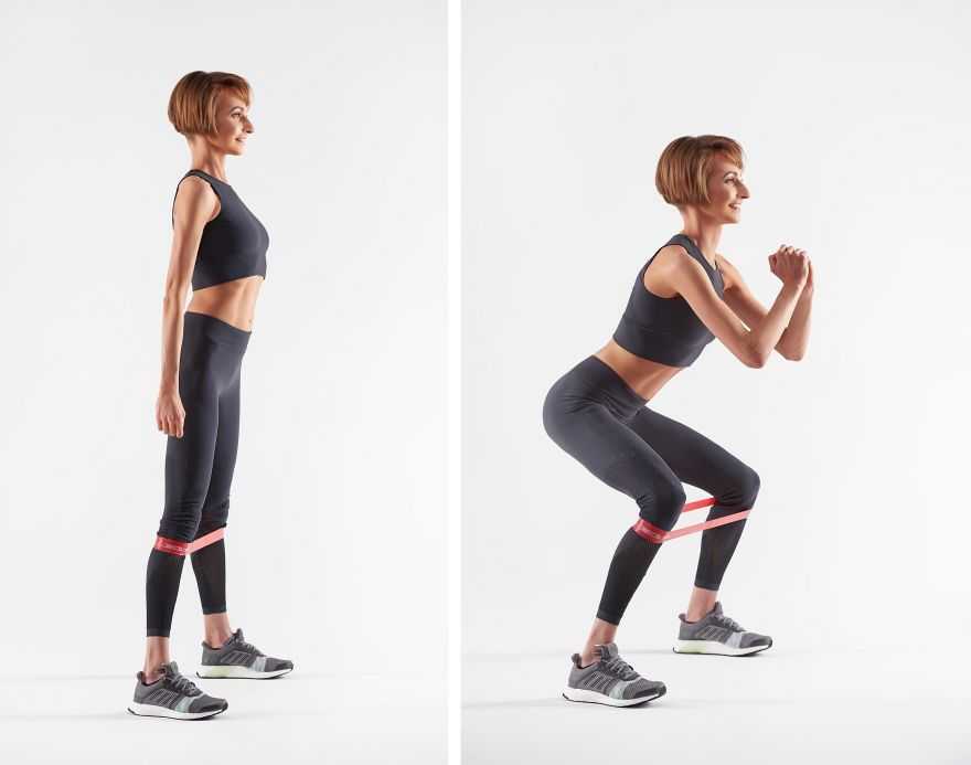 Третий подход: прорабатываем мышцы бёдер и ягодиц с резинкой в нижней части бёдер (выше колен).