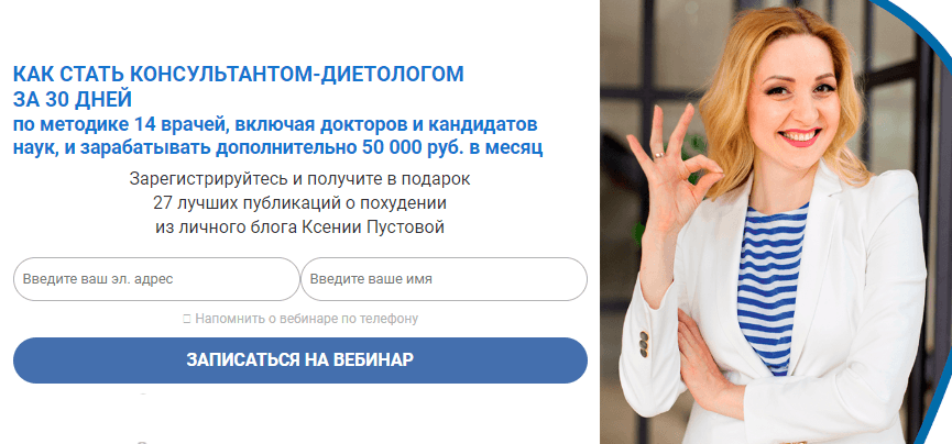 Бесплатный вебинар от Ксении Пустовой “Как стать консультантом-диетологом за 30 дней”