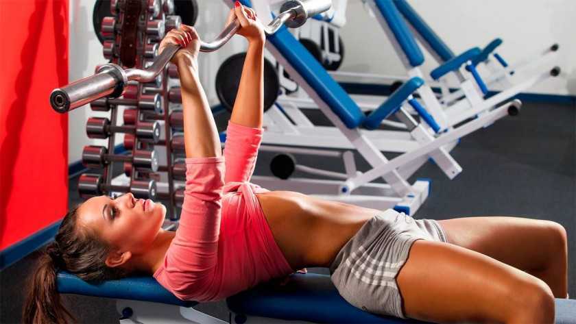 - Садимся на скамью, располагаем трицепсы на поверхности скамьи, локти на ширине плеч. В руках гриф штанги либо гантели.