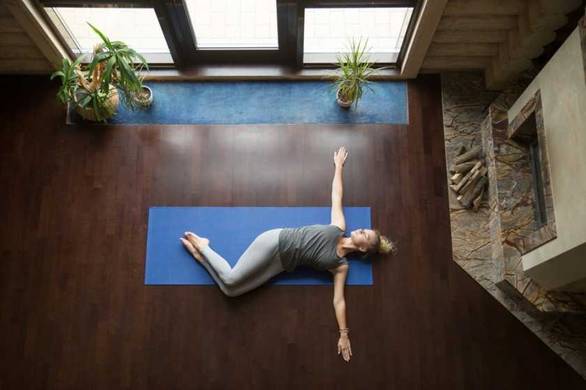 Лягте на спину, ноги согните в коленях. Стопа должна полностью находиться на полу, руки вытяните в стороны под углом 45 градусов по отношению к телу.