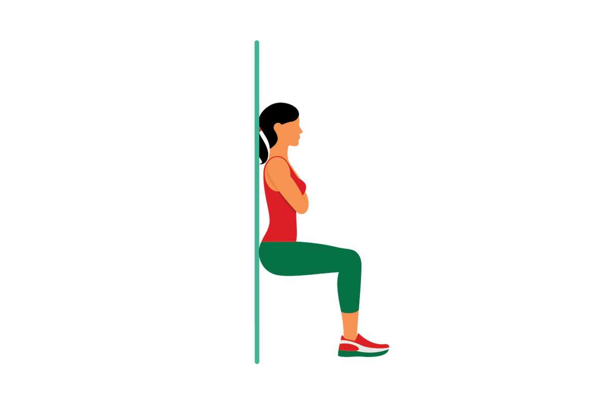 После выполнения предыдущего кардио упражнения, без отдыха и сохраняя высокий ритм сердцебиения, выполните статическое упражнение для укрепления мышц ног. Задержитесь в положении приседаний с опорой на стену, следя за тем, чтобы пресс и ягодицы были напряжены.