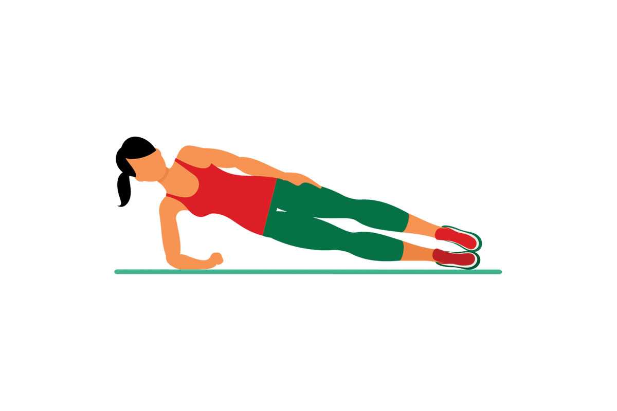 Данное упражнение помогает укрепить поперечные мышцы корпуса, а также мышцы ягодиц и бедер. При выполнении следите за тем, чтобы локоть располагался ровно под плечевым суставом — это поможет избежать травмы. Не опускайте бедра вниз или не поднимайте их слишком высоко вверх.