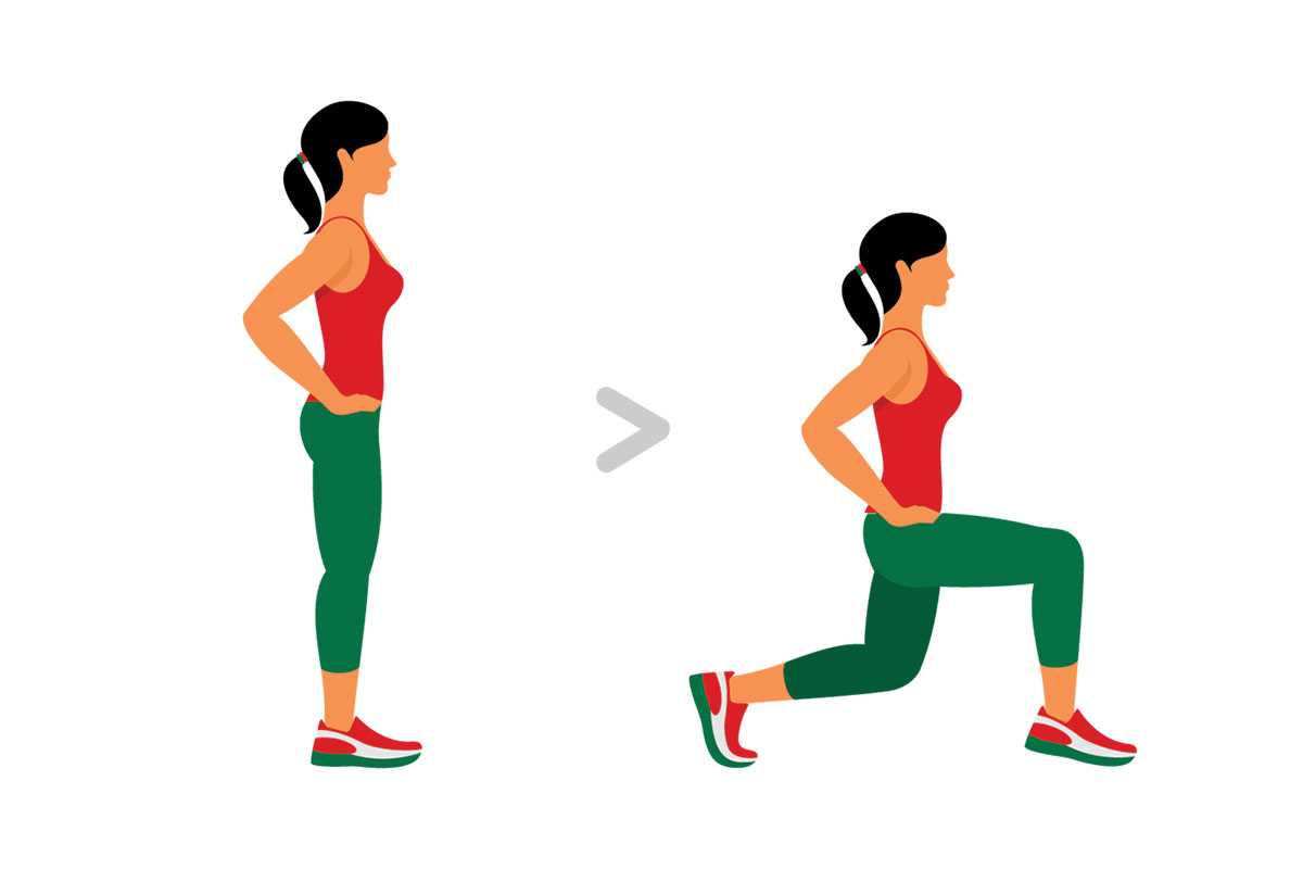 Исходное положение — стоя ровно, ноги на ширине плеч, руки на поясе. На вдохе совершите шаг вперед, одновременно сгибая ногу в колене. Следите за тем, чтобы корпус оставался вертикальным. На выдохе вернитесь назад, затем повторите для другой ноги.
