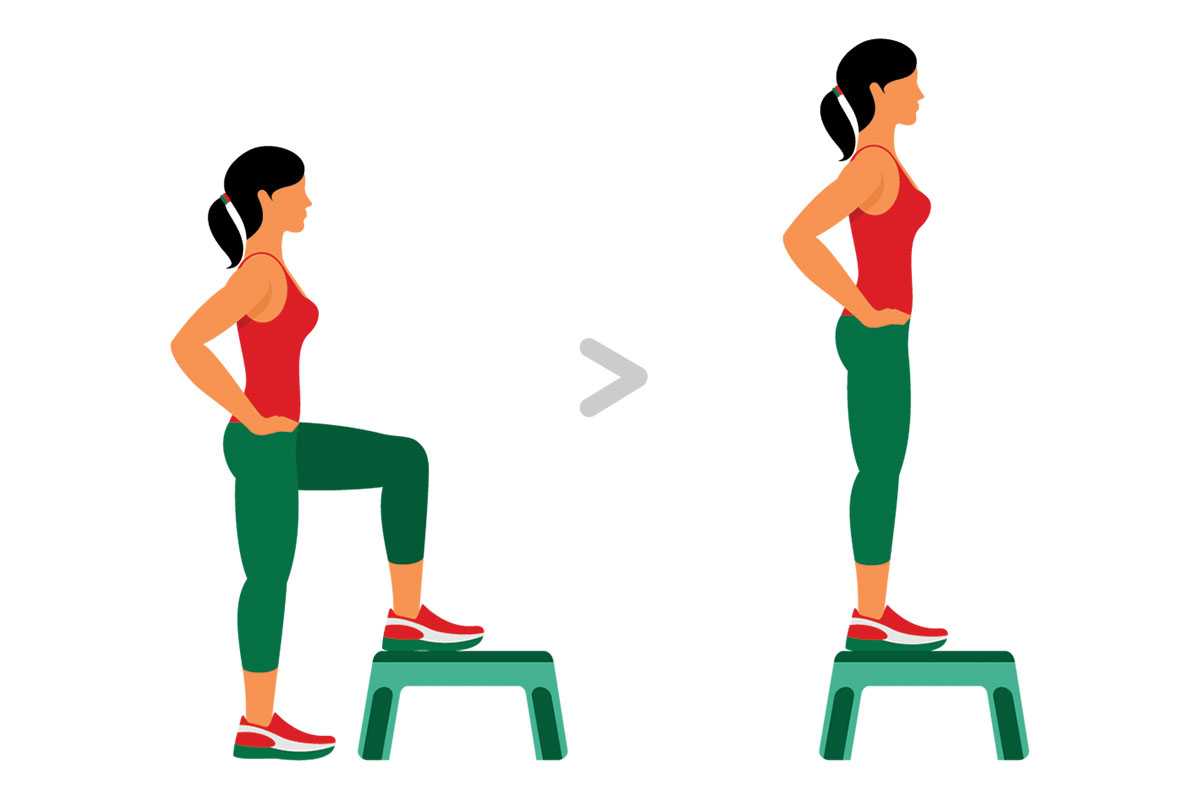 Одно из наиболее простых, но при этом эффективных, упражнений для средней ягодичной мышцы. При выполнении в быстром кардио режиме делает мышцы более упругими, усиливая циркуляцию крови и помогая сжигать жир. Поочередно зашагивайте на возвышение, сохраняя пресс в напряжении.