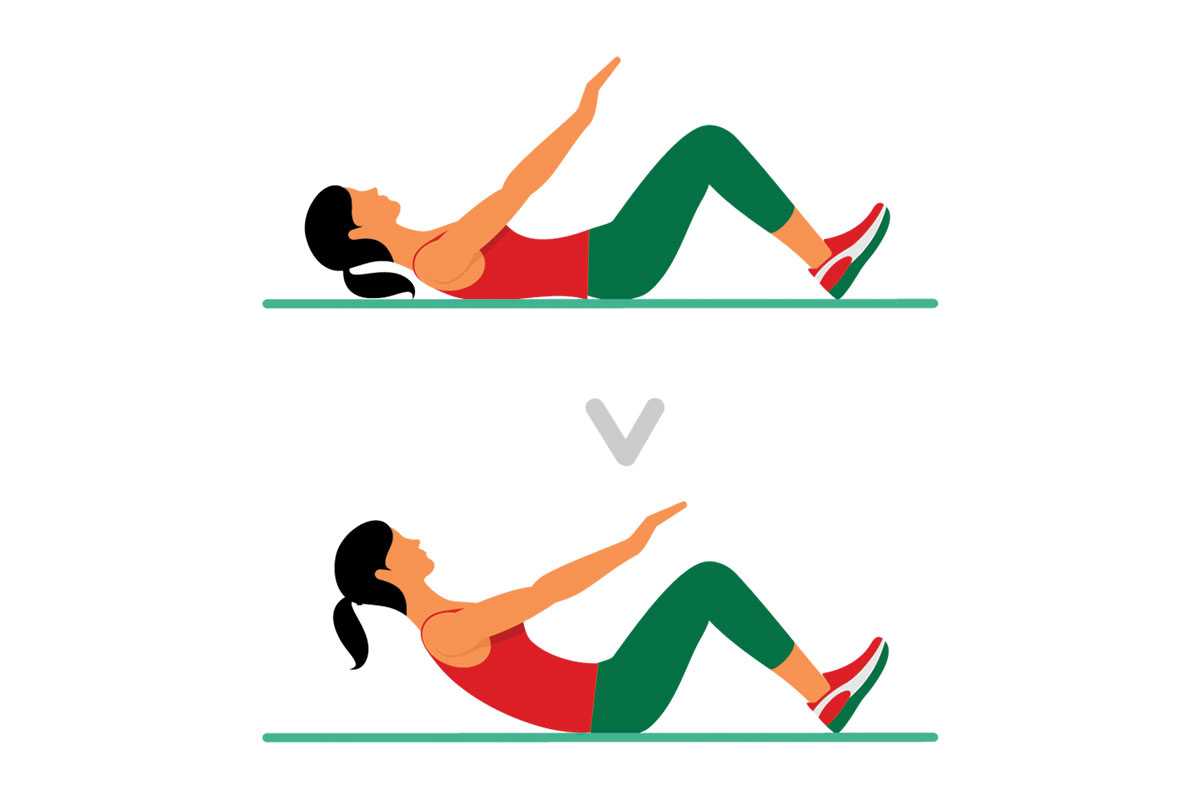 Исходное положение — лежа на спине, ноги согнуты в коленях и стоят на полу, руки вытянуты вверх. На выдохе, за счет активации мышц живота, начинайте тянуться по направлению вперед, отрывая верхнюю часть спины от пола. Задержитесь в верхнем положении, держа пресс в напряжении.